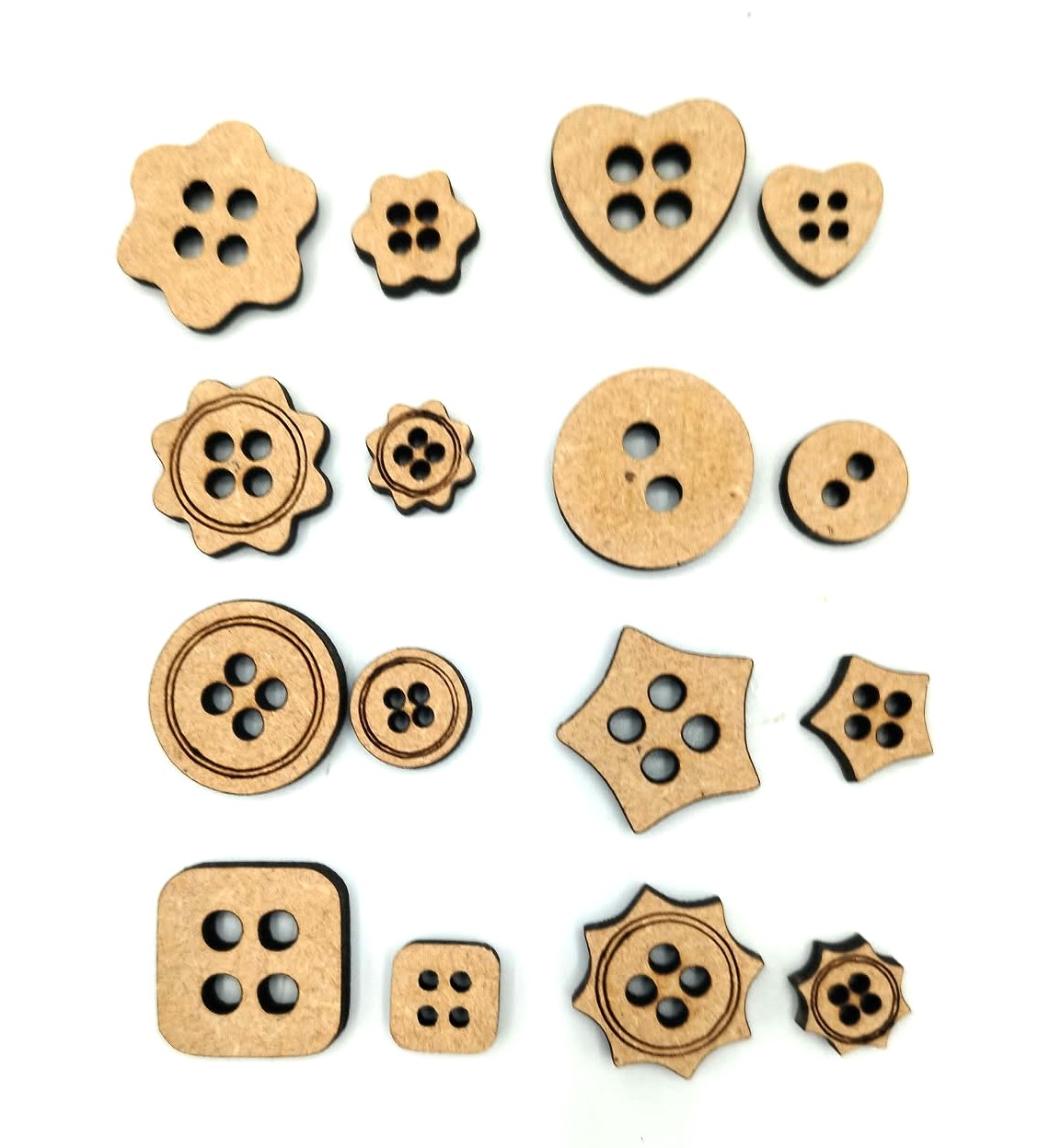 Add a professional finishing touch to your DIY projects with our Button Embellishment Shapes. This versatile pack includes 16 premium MDF buttons in a variety of classic and playful styles, ranging from 1cm to 2cm in size. Because they are cut from sturdy 4mm thick MDF, these buttons provide a wonderful 3D effect that cardstock simply cannot match.