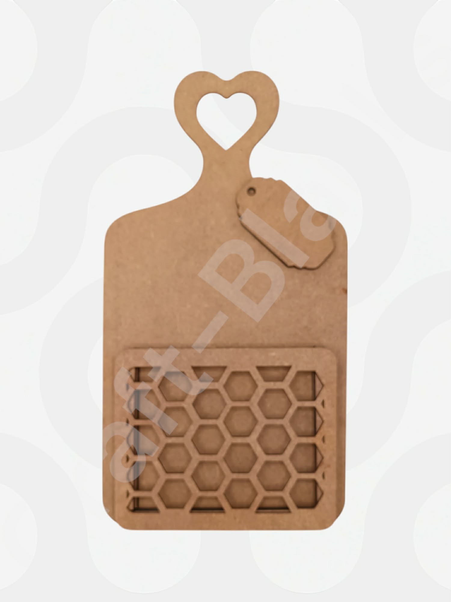 Add rustic charm to your kitchen with our Farmhouse Chopping Board Craft Blank. Specifically designed with a lattice-style pocket, this hanging heart-handle board is perfect for holding letters, spoons, or stationery.