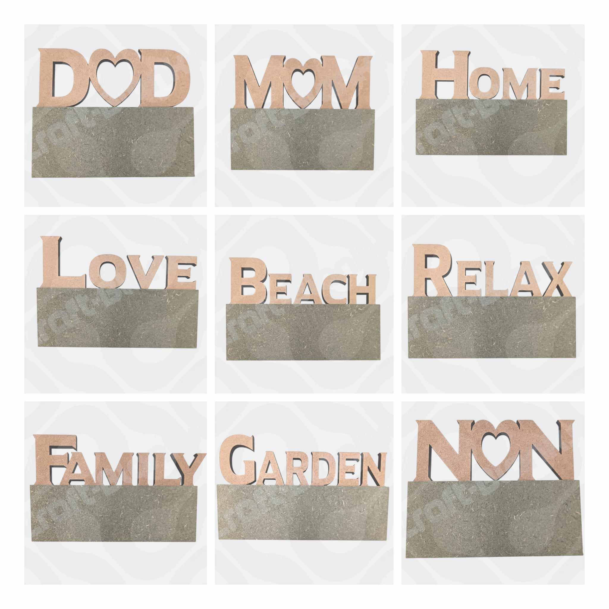 | Word blocks freestanding | Mum, Dad, Home, Love, Family, Nan, Friend, Beach, Garden, Believe, Relax, Daughter, Sister, Aunty, Grandad, Gran |